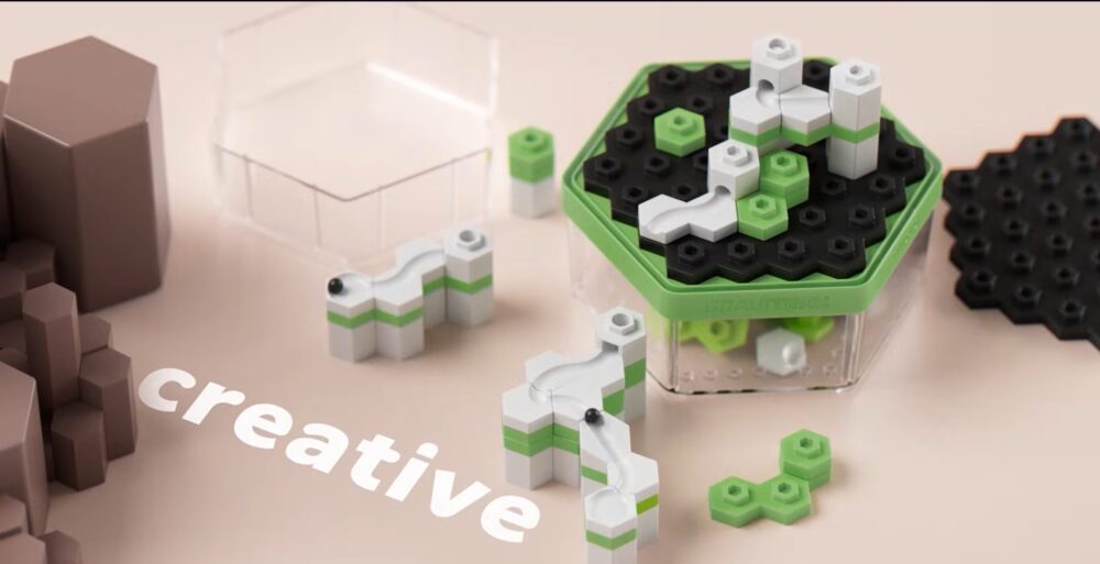 そして、最大の特徴は、タイルがくっついて一つになっているところでしょう。動画を見ると2つや3つのタイルがくっついてるのが分かります。そして、はめ方が普通のGraviTraxとは逆ということも注目すべきポイントでしょう。普通のGraviTraxでは凹んだ場所に凸の形をはめますが、マイクロは逆。凸の形のプレートに底が凹んだパーツをはめるようです。