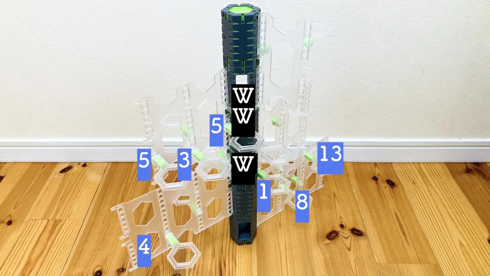 また、PROスターターや拡張バーティカルに入っているピラーの高さは7です。なので基本的にはピラーや柱タイル大を使って、数字に「.5」と書いてあったら柱タイル小を使うのが分かりやすいと思います。